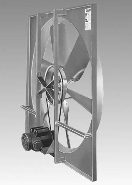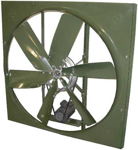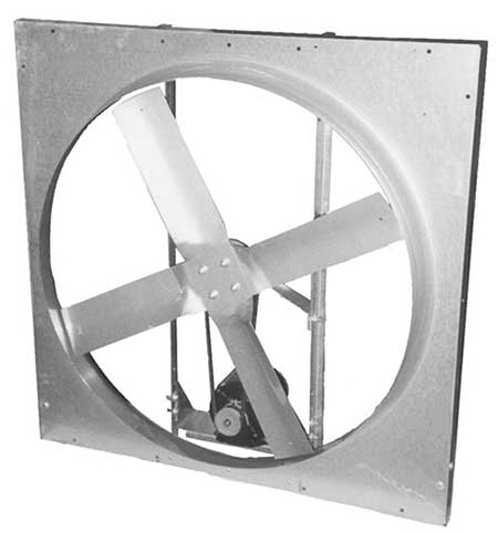 American Coolair’s Type NBF fan provides the solution to fresh air ventilation in most types of farm buildings. Type NBF fans are built to give you years of heavy-duty trouble-free service. The rugged, belt-driven construction operates in any position, has permanently lubricated ball bearings, and is available with single- or two-speed totally enclosed motors. Coolair has developed a complete ventilation system for farm use combining the Type NBF fan with a Type LRW all aluminum shutter and heavy gauge galvanized steel wall housing (square box or slope) for exterior mounting, allowing a maximum of unobstructed interior space.