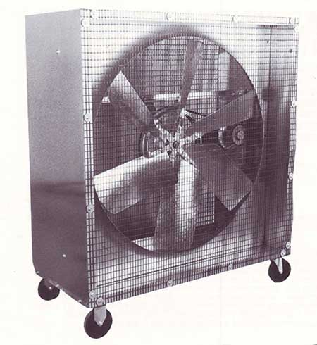 High volume, heavy duty mobile air circulator for cooling factories, warehouses, garages, loading docks, processing lines or any other hot, inaccessible areas where people must work. The Coolair mobile air circulator can be rolled to wherever it is needed on four heavy duty casters.